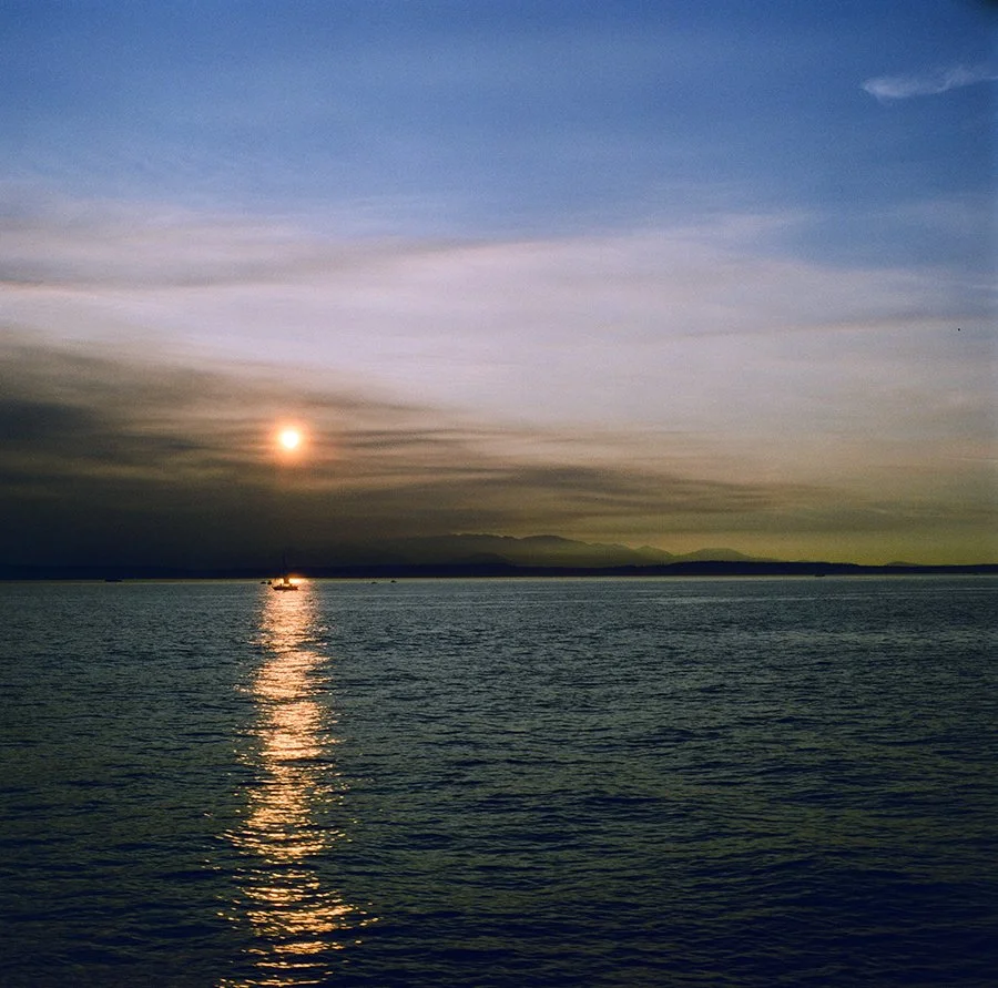 The setting sun reflecting off the skyscraper in downtown Seattle has a fun glow around it that reminds one just a tiny bit of the Eye of Sauron from Lord of the Rings. Thankfully Seattle is a much better place to visit than Mordor. Image made with a Hasselblad 500C/M.